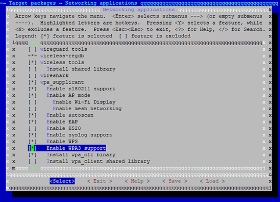 Target package->Networking applications->wpa_supplicant, then selectEnable WPA3 Support.Figure 3-3. menuconfig: Enable WPA3 Support for wpa_supplicant