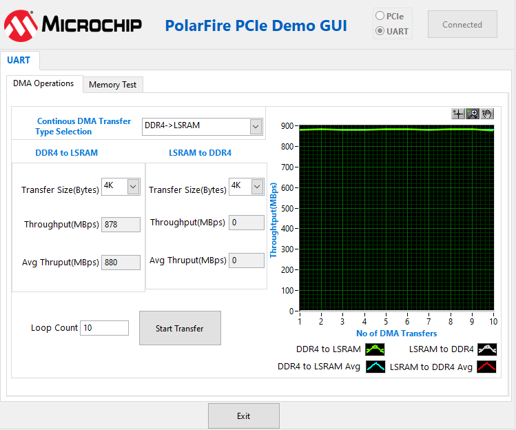 - Click Start Transfer. After a successful DMA operation, the GUI displays the throughput and average throughput in MBps. The following figure shows DMA throughput and average throughput from the DDR memory to the LSRAM.