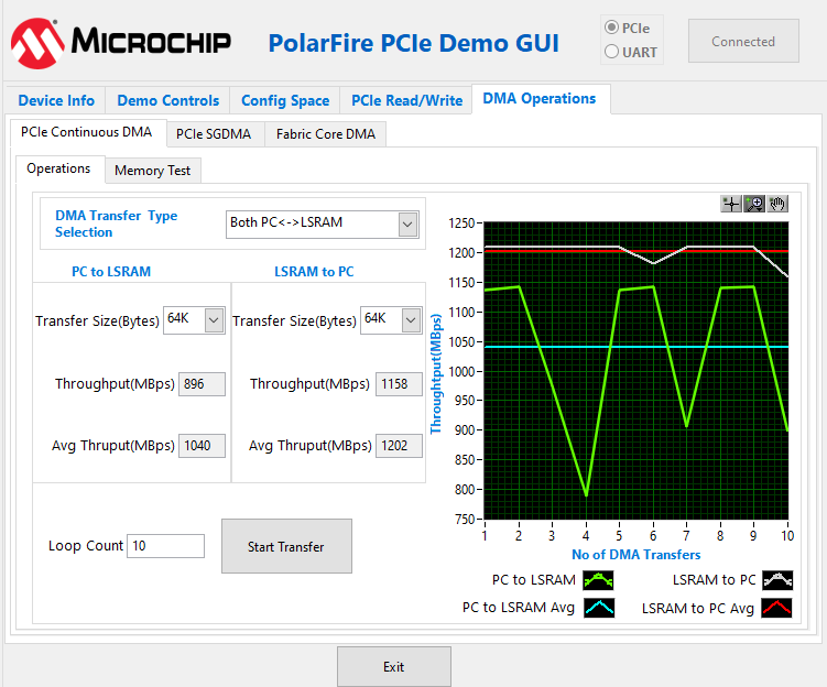 - Click Start Transfer. After a successful DMA operation, the GUI displays the throughput and average throughput in MBps.