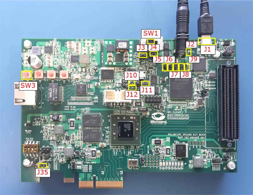 Table 3-1. Jumper Settings Jumper Description J5, J6, J7, J8, and J9 Short pin 2 and 3 for programming the PolarFire® FPGA through FTDI J11 Short pin 1 and 2 for programming through the FTDI chip J10 Short pin 1 and 2 for programming through the FTDI SPI J4 Short pin 1 and 2 for manual power switching using SW1 J3 Open pin 1 and 2 for 1.0V - Connect the power supply cable to the J2 connector on the board.