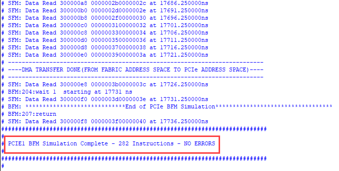 - After 18 µs, the simulation completes. PCIE1 BFM Simulation Complete – 282 Instructions – NO ERRORS message is displayed for Evaluation kit.