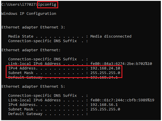 - Scan the output for the network adapter and locate the IPv4 Address for Ethernet to view the set IP address.