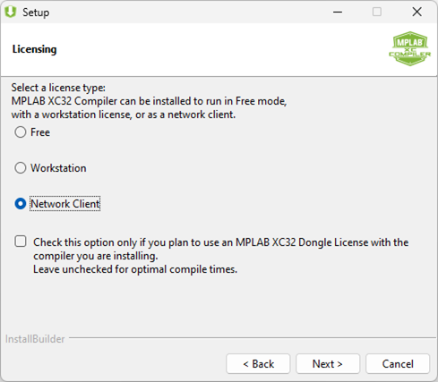 To install the compiler, follow the instructions in Basic Compiler Installation. Once you encounter Licensing, select the Network Client radio button as shown below. Click the Next button to continue.