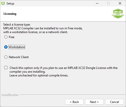 To install, follow the instructions in Basic Compiler Installation until you encounter the Licensing screen where you can select License Type. Select the radio button next to Workstation as shown below. Click the Next button to continue. Return to Installation Directory to complete the installation.
