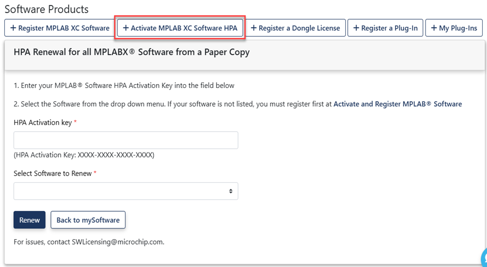 - Click Activate MPLAB XC Software HPA. Enter your HPA Activation Key and then under Select Software to Renew select from registered compiler licenses in the drop-down list.