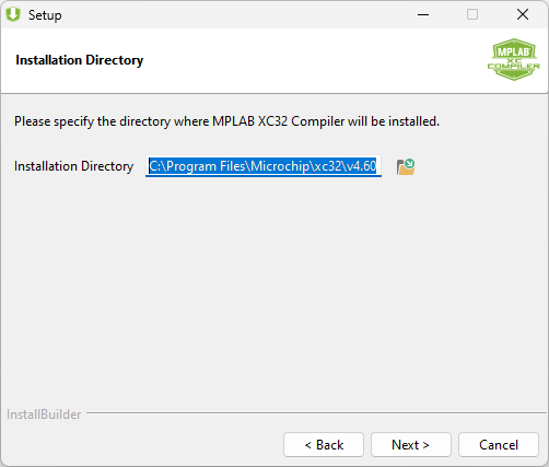 Enter or browse to a location to install your compiler. It is recommended to use the default location displayed in the dialog. Click the Next button to continue.