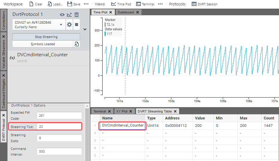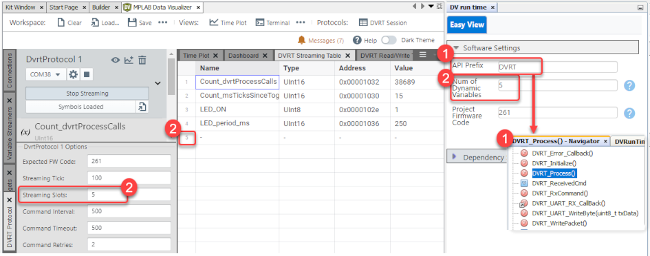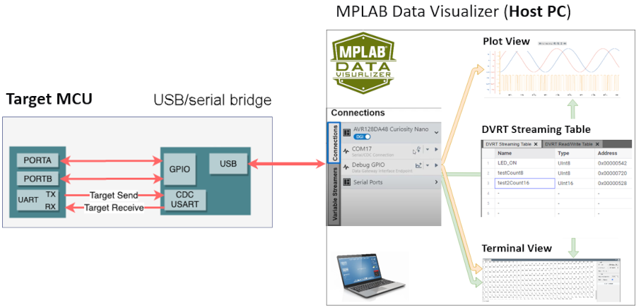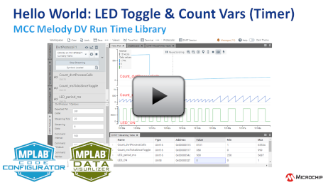 The MCC Melody Data Visualizer Run Time (DVRT) Library supports the the DVRT functionality of the MPLAB Data Visualizer on a host computer. The DVRT Library allows the user to "watch" and plot project variables at run time on the Data Visualizer plugin window.