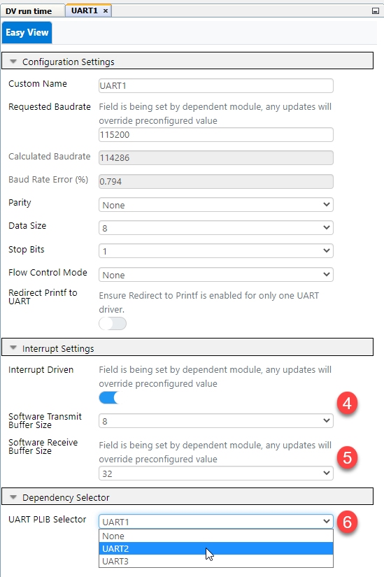 - UART Software Transmit Buffer Size: Only a single byte is used by DVRT, so this can be configured based on user project requirements.