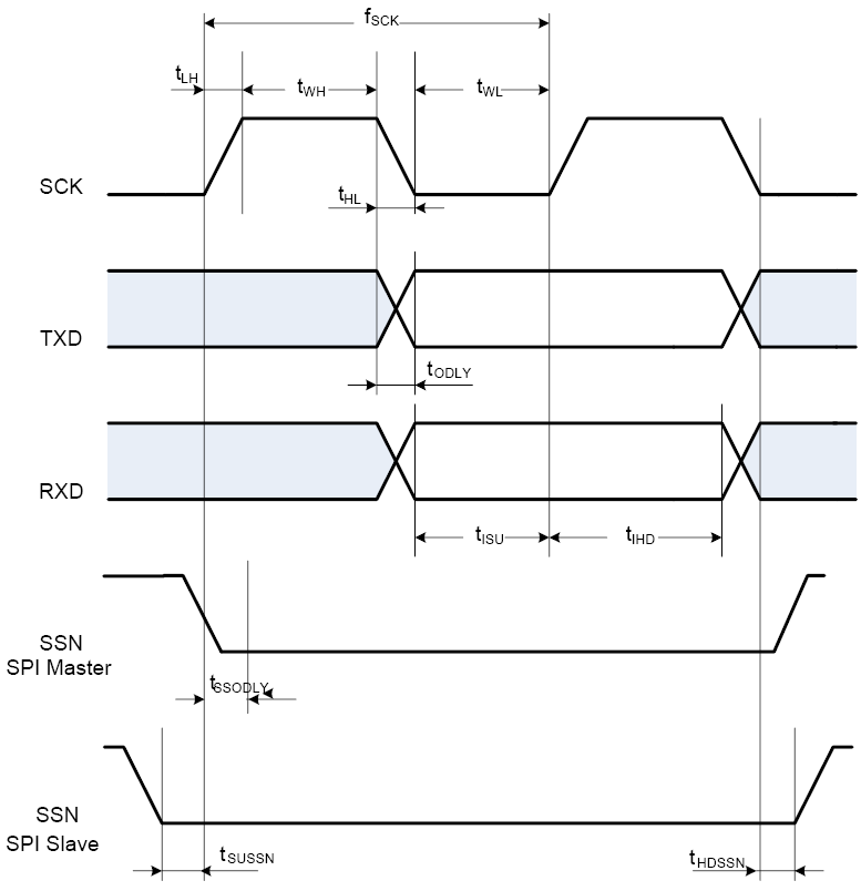 - Maximum clock frequency specified is limited by the SPI client interface internal design; the actual maximum clock frequency can be lower and depends on the specific PCB layout.