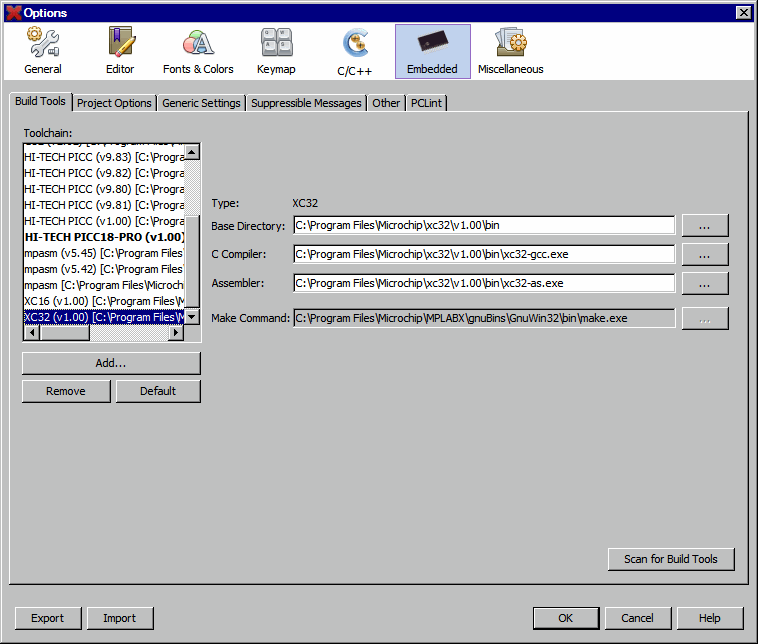 - From the MPLAB X IDE menu bar, select Tools>Options to open the Options dialog. Click on the “Embedded” button and select the “Build Tools” tab.