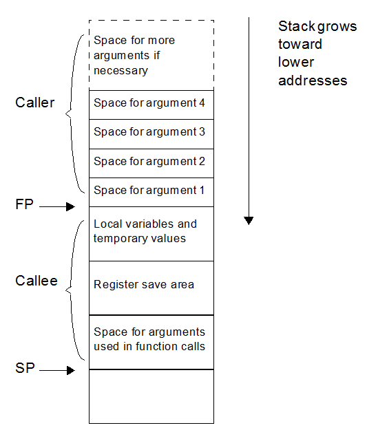 The run-time stack grows downward from higher addresses to lower addresses (see the figure below). The compiler uses two working registers to manage the stack: