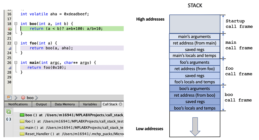The stack is a memory region that grows dynamically at runtime. It starts at high address and grows to lower address (stack grows downward).