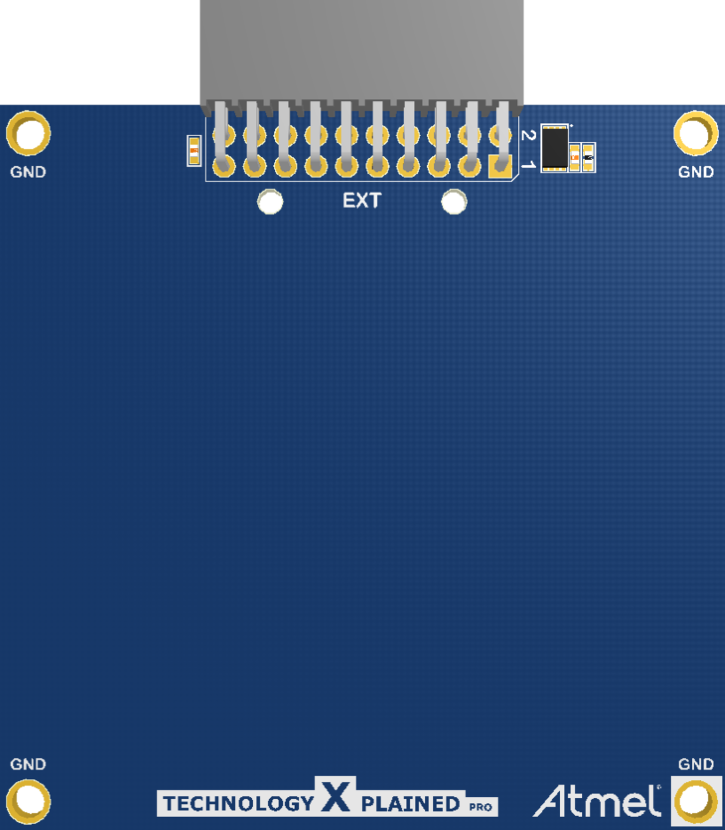 This board size is designed to fit on all Xplained Pro MCU boards, but with an orientation for the header at the bottom of the Xplained Pro MCU board. Note that the board is too wide to be connected next to another extension board on the right hand side.