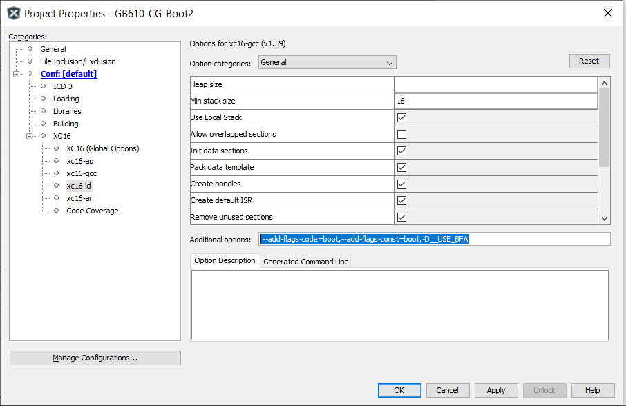 When using CodeGuard(TM) Security, the compiler and linker need to be told where to place the code and how the memory should be marked in the linker file. This is a very important step and if not done, the bootloader will not function. The bootloader needs to have an additional set of options added to the linker command line. This is done by adding the commands " --add-flags-code=boot,--add-flags-const=boot,-D__USE_BFA" to the Additional Options in the linker screen as shown below.