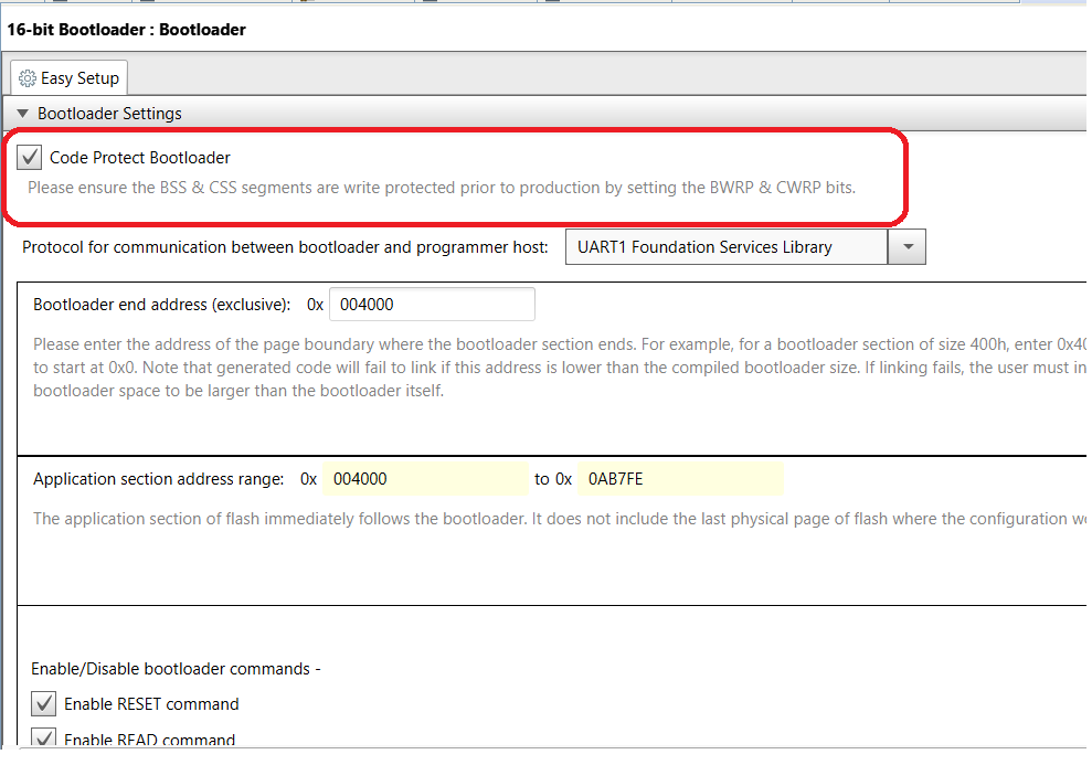 When selecting Code Protect, the CodeGuard(TM) Security module is enabled allowing the application to have its own interrupt table. The application will use the alternate interrupt table (AIVT). MCC adds the code to enable the AIVT in the bootloader file boot_process.c and in the function BOOT_StartApplication(). The result is that the interrupts controller will switch prior to calling the code. However, it is imperative that the user adds the code to disable any bootloader enabled devices that could cause interrupts at this point. If this is not done, the interrupt routine that is called will be the one in the application code.Bootloader Additional Linker Arguments.