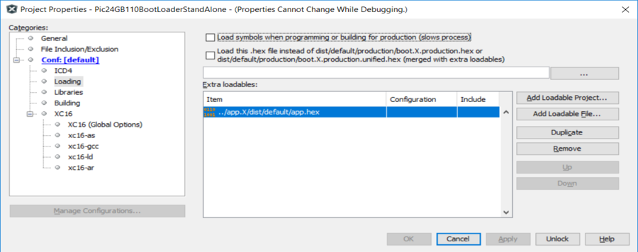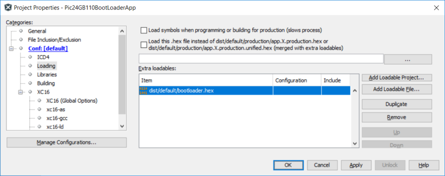 Append the bootloader hex file created by hexmate into the application environment using the "Project Properties "Loading->Add Loadable File as shown below. This will "overlay" the bootloader binary code onto the application code. It's important to note the two programs are do not overlap code areas where they could be different. The interrupt tables and config words will be identical though so if they overlap, there will be no harm done. Also since the code created by the bootloader is at a different area (by design) that the application code, there should be no harm here either. | ||