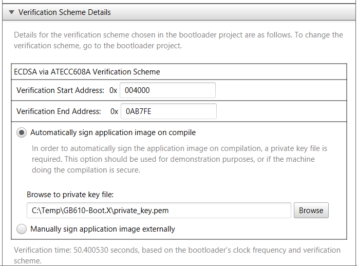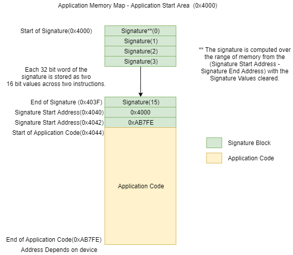 When using ECDSA verification, a SHA256 signature needs to be generated and stored inside the application binary. This signature is used by the bootloader to verify the application code was signed with the users private key. The bootloader uses the public key generated from the users private key along with the signature stored in the application binary to verify the contents of the application code is valid and has not been modified in any form. The two parts of the final application code consist of the two regions of memory shown below. The first is the signature block which contains the signature of the code along with the start and end address of the application itself. The second part of the memory space is the application itself.