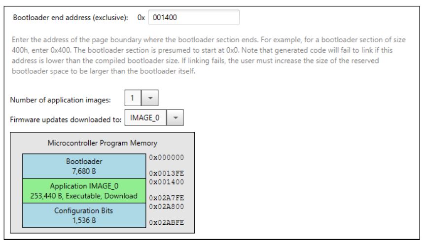 The bootloader configuration screen shown below is for the basic Single Partition Configuration Screen. Notice that there is only a single Application Image and this location will be used for both the Executable and Download location. The maximum size of this image is the amount of the flash not used for the bootloader.