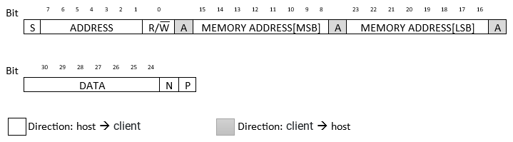 Initiate communication by transmitting the 7-bit device address along the start signal to select the client device. Upon successful selection, the client device will acknowledge by sending an acknowledgment bit to the host, indicating its readiness to receive a command.