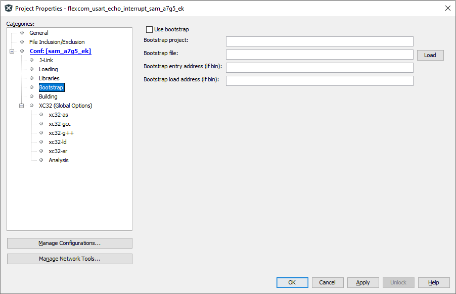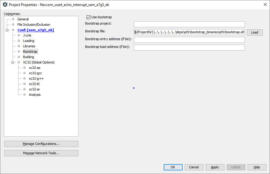 To use at91boostrap to load and run harmony applications from MPLABx, it should be build with “bkpt_none_defconfig” configuration. If the user is interested in building at91bootstrap using MPLABx, the user can read about it here.