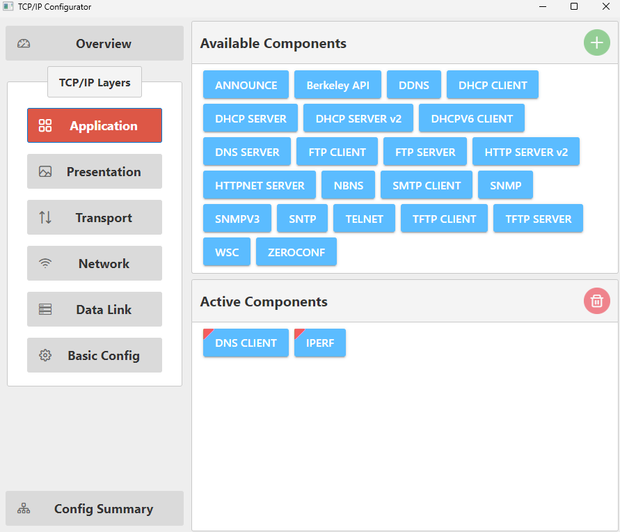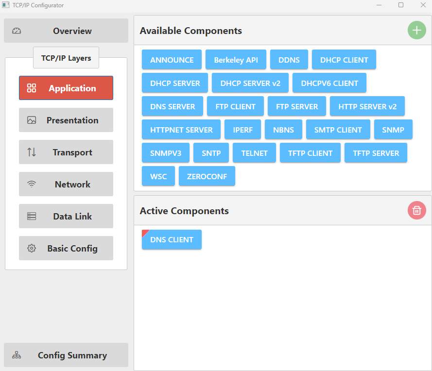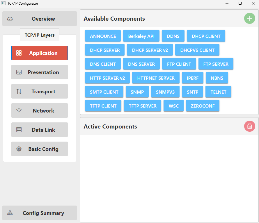 Begin selecting the required TCP/IP application layer protocols from the “Available Components” on the right-hand side.