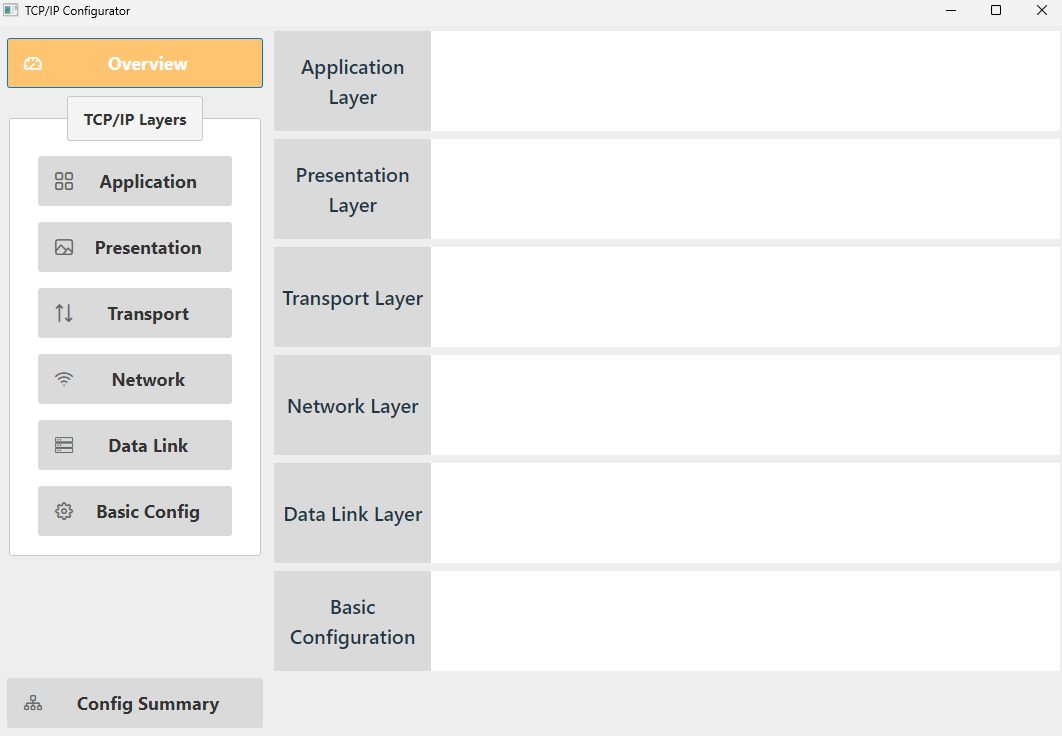 This action opens the "TCP/IP Configurator" window. The "Overview" section displays the available TCP/IP layers.
