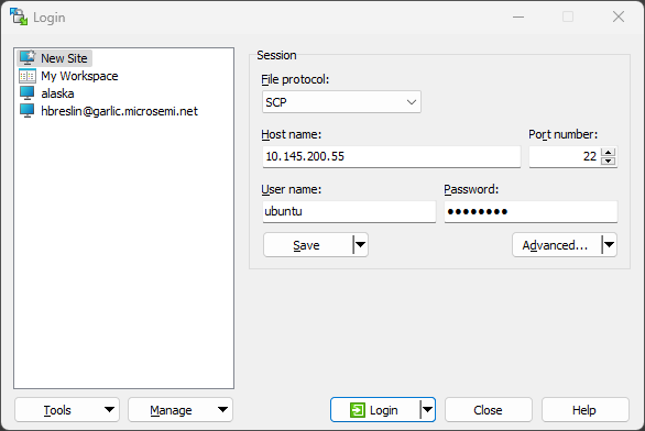 Launch the transfer manager of your choice (in this case, WinSCP is used) and connect to the kit. In this case, the SCP protocol is used.