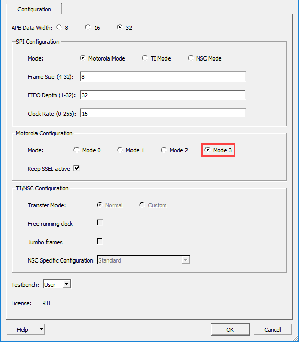 - Mode: Select Motorola Mode (default) as the target SPI target supports Motorola mode. Mode 3 is selected under Motorola Configuration.