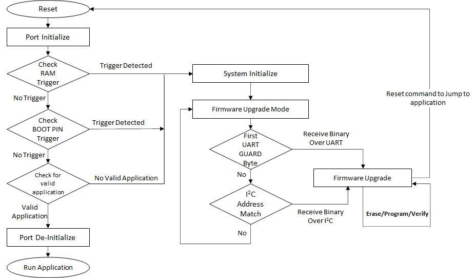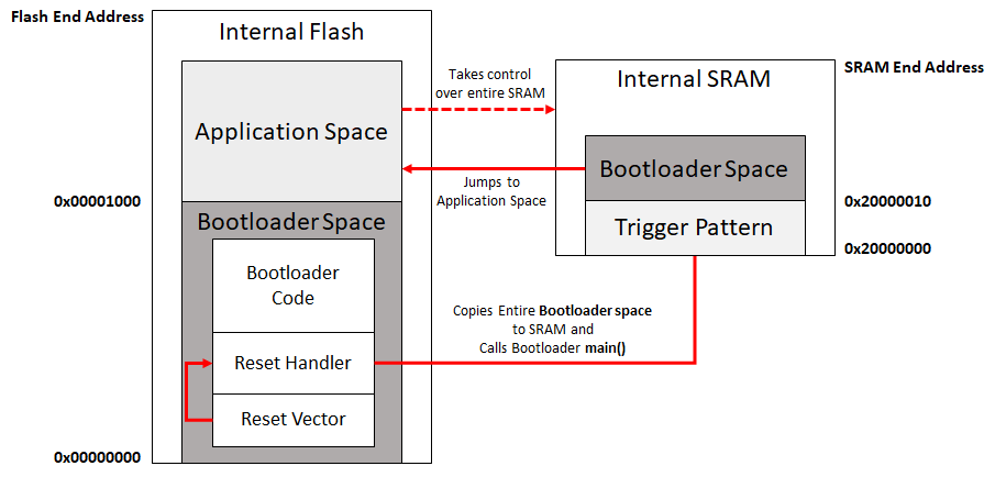- Internal trigger: Bootloader will be triggered based on the trigger pattern written at a specific location in the SRAM by the application firmware.