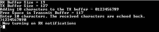 - It then adds 10 characters, “0123456789”, to the transmit buffer and displays the available free space in the transmit buffer after the 10 characters have been added