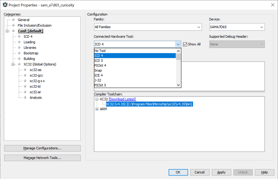 Note: If no debugger is connected, click on the “show all” check box and select the supported debugger. - Select the target toolchain and click on apply to save the changes