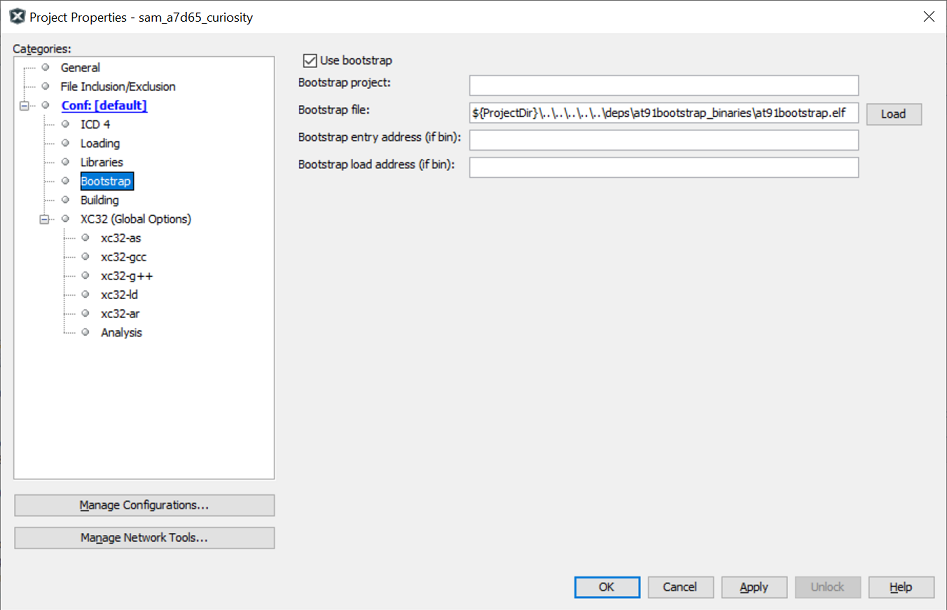 To use at91boostrap to load and run harmony applications from MPLABx, it should be build with “bkptnone_defconfig” configuration. If you are interested in building at91bootstrap using MPLABx, you can read about it here.