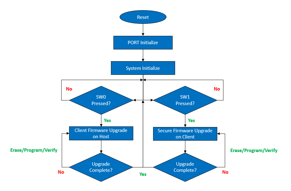 The first time, the Secure Firmware Upgrade application is programmed using the Host and Bootloader application on the host and client. The following topic discusses the MPLAB Harmony v3 Host and Bootloader application system-level execution flow.