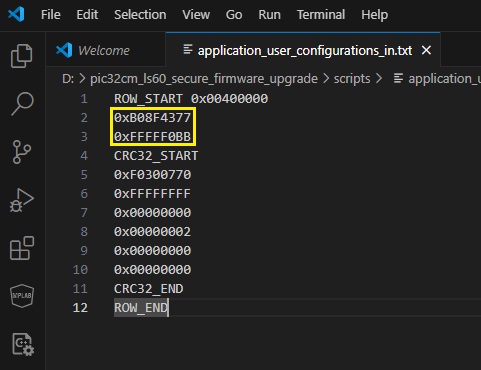 btl_dev_cfg_gen.py) to create theapplication_user_configurations_out.txtconfiguration file. Thebtl_host.pyscript will use this file to update the configuration bits while programming the target or client application.python <harmony3_path>/bootloader/tools/btl_dev_cfg_gen.py -v -f <downloaded path>/ pic32cm_ls60_secure_firmware_upgrade/scripts/application_user_configurations_in.txt -o <downloaded path>/ pic32cm_ls60_secure_firmware_upgrade/scripts/application_user_configurations_out.txtFigure 6-7. User Row Configuration File Generation