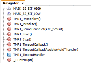The PLIBs provide a fully functional interface for the peripheral functionality, but which is not fully provided by the Driver. In the image below, one can see the MPLAB X IDE Navigator view of the generated API.