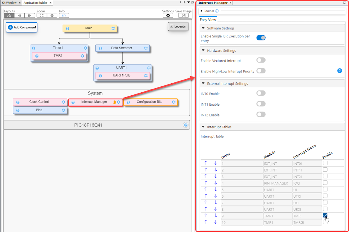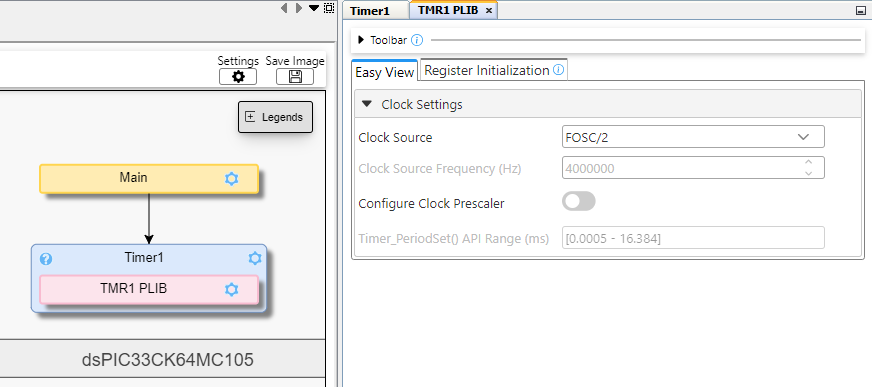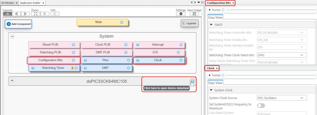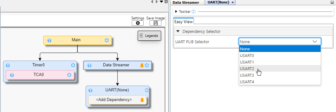 The Easy View for Libraries relates to software configuration settings, i.e., will not have anything to do with registers for hardware peripheral or off-chip components. For example, the Data Streamer Library implements the Data Stream Protocol needed to plot multiple variables on the MPLAB Data Visualizer. Its configuration is a list of variables and their respective types.