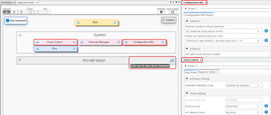 Drivers between the PIC18F16Q41 and the dsPIC33CK256MP508 shown below.- Configuration Bits: Set up the clock source for the system clock, whether or not the watchdog timer is enabled, etc.