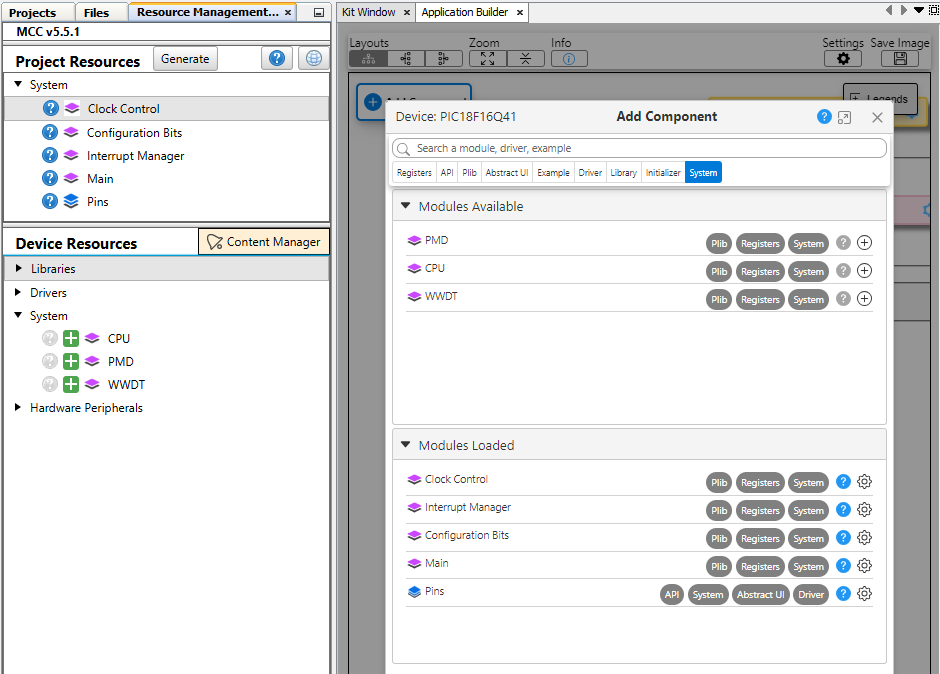 For most Peripheral Drivers, the PLIBS are automatically selected and added to the Project. The PLIBs provide a non-portable interface and are only accessible from the Builder view when the corresponding driver is added to the Project Resources. They are hidden from the Device Resources, Project Resources.