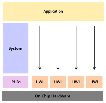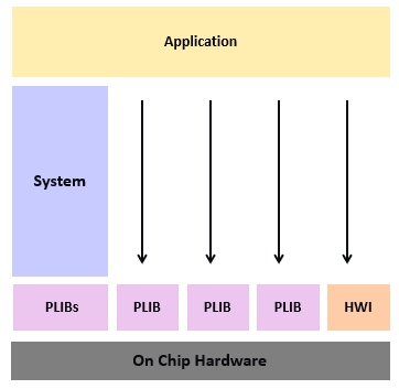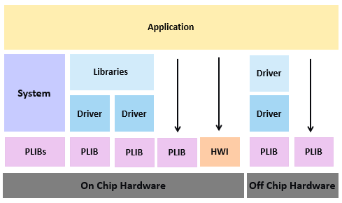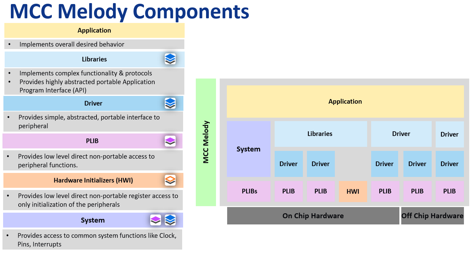 MCC Melody supports higher-level development based on portable Libraries and Drivers to very low-level-device specific development based on PLIBs (Peripheral LIBraries) and Hardware Peripheral Initializer-based.