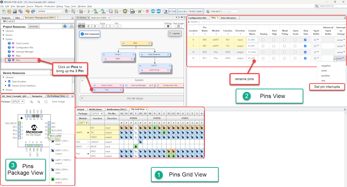 After a specific pin has been assigned, either in Pins Grid View or Pins Package View, other pin aspects can be configured here. This pin functionality includes setting the pin as default high/low after initialization, enabling an internal pull up or associated interrupt options (e.g., falling edge), etc.