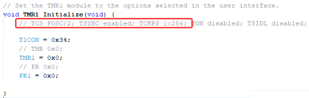 The TMR1_Initialize function corresponding to the above configuration is shown below. Note how the configured settings are described in the generated comments.