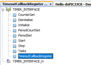An example application-level code for the dsPIC33CK is listed below, showing the use of the TimeoutCallbackRegister API from the Timer Interface.