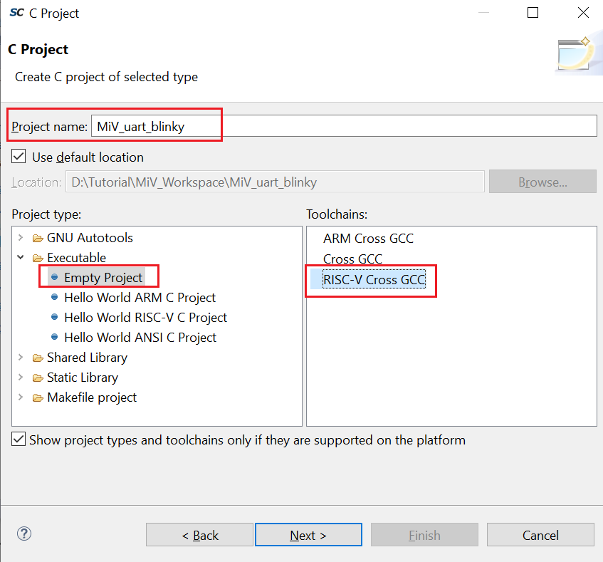 - Enter a name for the project in the Project name field. For example, MiV_uart_blinky.