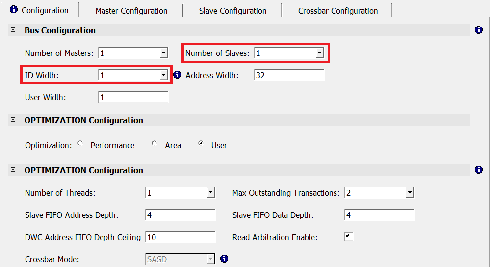 - Under the Configuration tab, in the Bus Configuration section, configure the COREAXI4INTERCONNECT IP to have one slave with an ID width of 1, as shown in the following figure. Leave the rest as defaults.