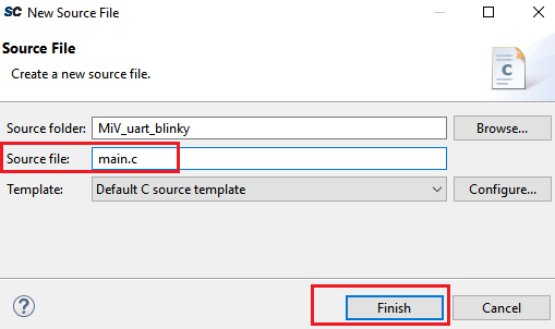 main.cin the Source file field, and then click Finish, as shown in the following figure.Figure 3-10. main.c File Creation