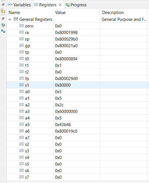 - Click the Registers tab to view the values of the Mi-V internal registers, as shown in the following figure.