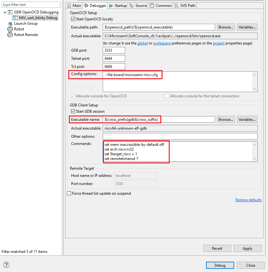 set mem inaccessible-by-default offset arch riscv:rv32set $target_riscv = 1set remotetimeout 7Figure 3-32. Create, manage, and run configurations Window – Debugger Tab