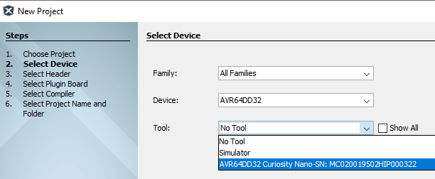 When creating a new project, the part number on the Curiosity Nano will be detected, as will the debug tool.