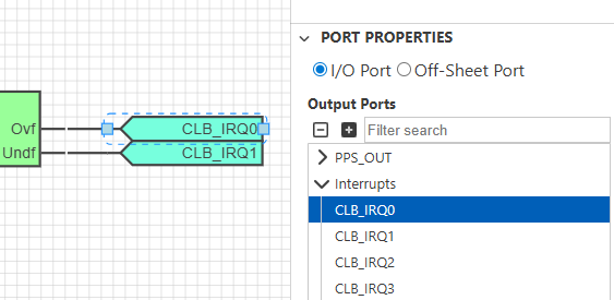 A CLB logic design can interrupt the MCU using one of the interrupt output signals from the CLB. In the CLB Synthesizer toolchain, use a regular output port and select one of the available signals from the Interrupts section in the Port Properties view.