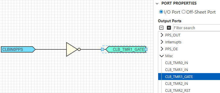 In the CLB Synthesizer GUI, configure an output port by selecting the peripheral signal to route to in the Port Properties panel.